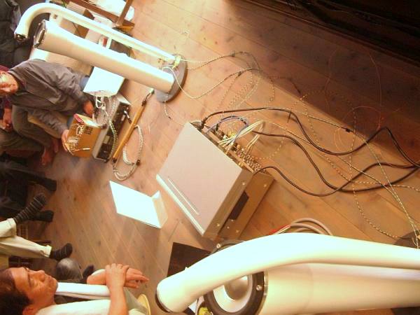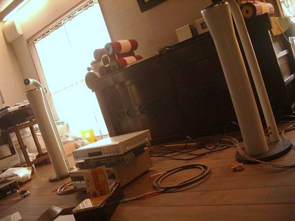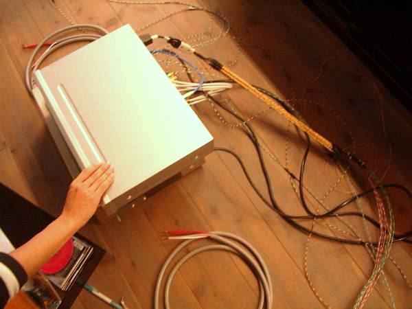 電源ケーブルとスピーカーケーブルを龍仙人さん特製のケーブル(主として銀線とプラチナ泊と絹糸で構成)に切り替えて比較試聴。ちなみに写真の棒状の部分は竹ひごに銀とプラチナ線を(長さを稼ぐため)ぐるぐる巻いているだけでコイル(インダクタンス)ではないとのこと。