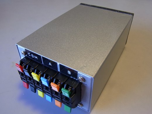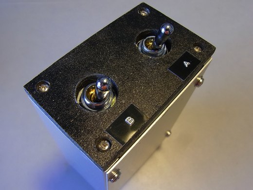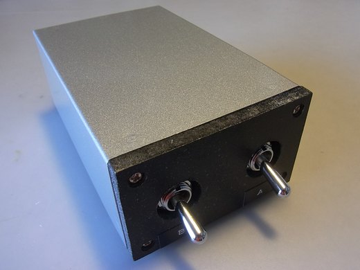 このように単なる切替スイッチボックスなんですが、無理矢理に特徴を言えば、2つのスピーカーを切り替えるのに、わざわざ2つのスイッチを用いていることです。普通ならトグルスイッチのN.0.とN.C.の2接点を用いればAとBの2つのスピーカーを切り替えるのに1つのトグルスイッチで可能です(その方が操作もシンプルです)。でもそれだと、ブラインドテストを行った際にカチカチ音の回数を数えれば(奇数/偶数により)切り替えた状態の予想が出来てしまいます。2個のスイッチを用いることで、切り替えた状態が全く分からないためブラインドテストに好適となります。それと、両方のスピーカーともオフ、両方ともオンという状態も設定可能となります。