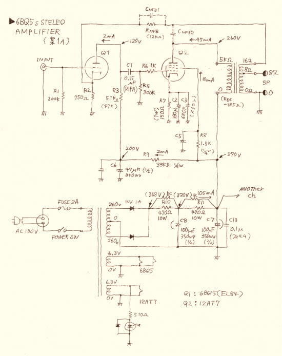 何の変哲もない素朴な5極管接続シングルアンプです。真空管らしい雰囲気を出すため手書き図です。