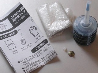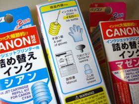 先日、キャノン、エプソンの詰め替えカートリッジに関する特許裁判結果が出たようですが、このタイプ(ユーザーがインクを注入するタイプ)は、それとは無関係のようです。近所のダイソーでも今尚ちゃんと売られていました。