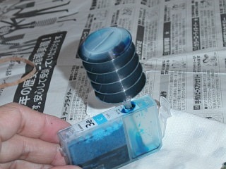 ・インク注入後は、早くゴム栓をしなければ、下になっている供給口(プリンタにインクを送る丸穴)から