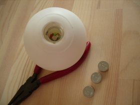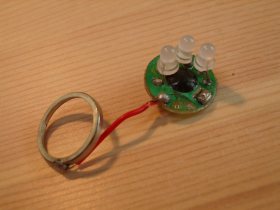 電源はLR44型ボタン電池3個。スイッチは無い。絶縁紙を取り、電池を入れて電池ホルダー(蓋)をキュと締めると光り出す。でも、ほんの数時間で電池がなくなった。やっぱり使い捨ての玩具なんだろうか。