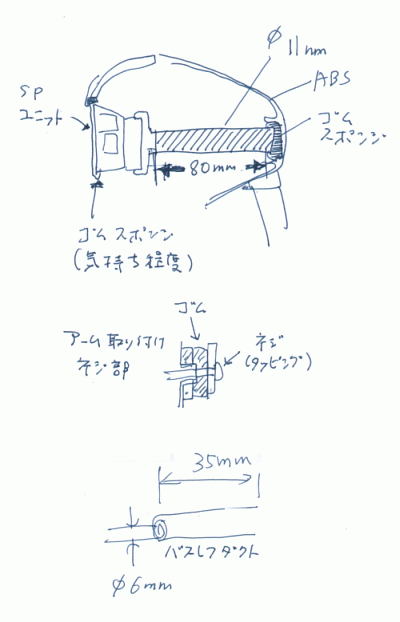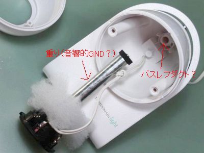 このタマゴ型の形状と、スピーカユニットの後ろ(マグネット部分)に錘(おもり)が取り付けてあるのと、