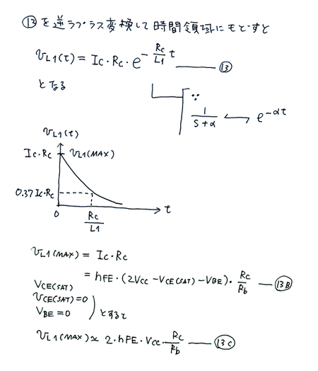 (補足)上記式よりトランジスタをオフした瞬間にコイルに起電する電圧は負荷抵抗Rcに比例する。つまりRcを無接続(抵抗値∞)の場合は非常にお大きな電圧が発生(実際はトランジスタの降伏により制限された電圧)し、トランジスタを破損する可能性があるので注意が必要です。