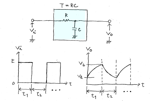 下図のようにRC積分回路に連続パルス(矩形波)電圧Viを入力し、出力電圧Voを考察する。