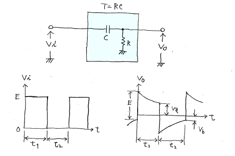 RC積分回路やRC微分回路の時定数に対して十分に長い周期の連続パルス電圧を入力した場合の出力電圧波形は、その立上がり、立下りに、それぞれのステップ応答を適応すれば容易に理解できますが、回路の時定数に対して短い周期(高い周波数)の連続パルスが入力された場合の出力波形(振幅値)の定量的理解は意外に分かり難いです。