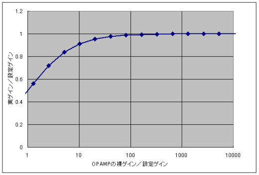 さらに、上式から、オペアンプの(裸ゲイン/設定ゲイン)と(実ゲイン/設定ゲイン)の関係をグラフ