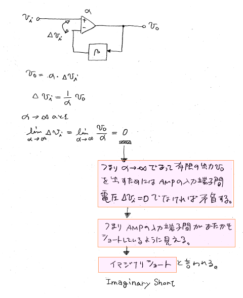 イマジナリーショートたは、つまり、OPアンプの裸ゲイン(フェードバックをかけていないOPアンプそのものの利得)が莫大に大きいことの別表現なのです。