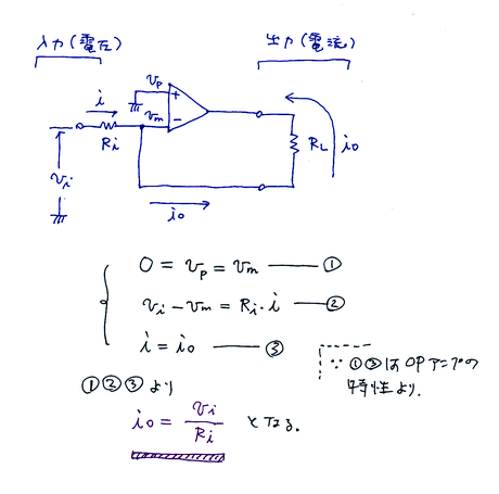 例えばRs=100Ω、Ri=10KΩ、Rf=10KΩでVb=1Vを入力すると出力電流Ioは10mAとなります。
