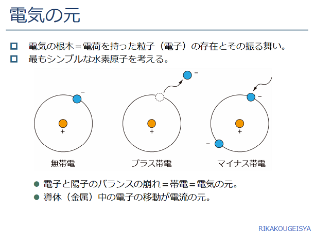 - これらが帯電という現象の根源で、つまり電気の元となります。