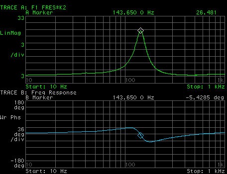 42Hzにバスレフダクト共振があり、160Hz程度にスピーカーユニットの共振があるのが分かります。