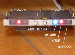 PC本体に全く触れることなく、2台のPCの起動と終了ができます。HDアクセス状況も分かります。操作するPCは、キーボードでCtrlキーを2回連続して叩くと切り替わります。とても便利で、もう手放せません。