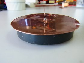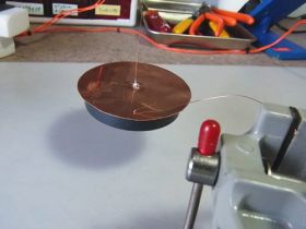 このファラデーの単極モータの場合も、永久磁石を固定体として、回転体である銅円板の中心と外側の間に電流を流すと、回転体(銅円板)がクルクル回転します。これだと、通常のモータと何ら変わらないのでぜんぜん不思議でないのですが、単極モータの不思議なとこは、下の実験写真のように銅円板と永久磁石とを合体させると合体したまま回転してしまうことです。