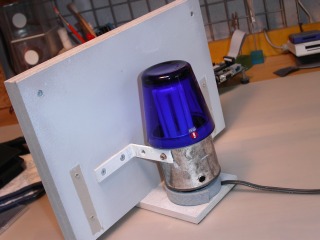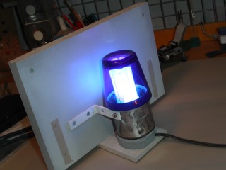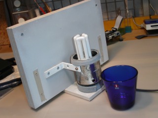 裏側はこんなのです。白色蛍光電球に、たんに、青色透明ガラスのコップをかぶせただけなんです。コップの支えは、リリーの缶詰の空き缶です。コップと電球が見えないように、正面を灰色に塗装した合板で目隠しました。この目隠し板は、ある程度厚みがあった方が安定感があって良いです。