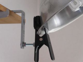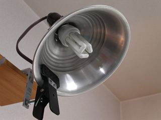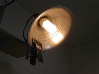 雑貨屋さんで購入した照明器具の取り付け方法を変えただけなんですが、ずいぶん雰囲気が変わりました。元々は照明の付け根の部分に取り付け金具が付いていたのですが(元来の器具の写真は撮り忘れました)、なんだかアリキタリなんで、下の写真のように大型クリップで傘をつかんで取り付けてみました。