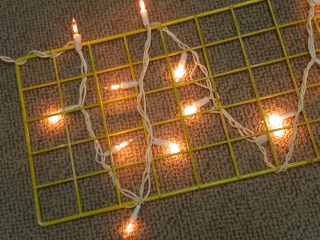 どこのホームセンターにでも必ず売っている白いアミのようなやつ(?)に黄色のカラースプレーでペイントし、2つをちょうど良い長さになるようにインシュロックで合体させ、使わなくなったクリスマツリー用のイルミネーション電球をくるくる巻き付けただけです。見たまんまです。