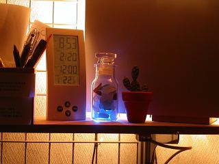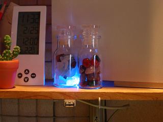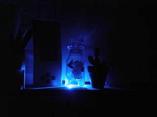 部屋を真っ暗にすると、こんな感じです。ガラス瓶がブルーに輝きます。