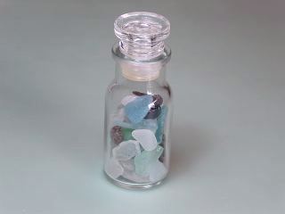 妻が茅ヶ崎の海岸で拾い集めた綺麗な石たちを入れたガラス瓶(市販香辛料の空ビン)