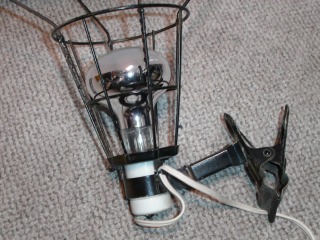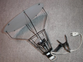 ホームセンターなどで売っている工事用白熱球照明器具のフレームに、針金ハンガーを解体した太針金を細い針金でぐるぐる巻いて、その上から半田付けでしっかり固定します。