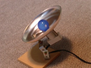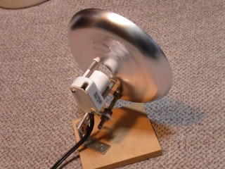 構造は見ての通りで、とても簡単です。丼鍋用の蓋の中央には、もともと穴があいています。その穴をリーマーで少し大きくして、その穴に電球(クリブトン電球)を通し、ソケットに取り付けます。ソケット(E17)と鍋蓋との固定はスペーサを用いて、ねじ止めです。