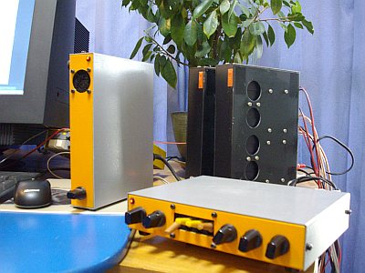メインディスプレイはDVI(デジタル)でサブディスプレイはアナログRGBなので、DVIの切り換え器に同期してアナログRGB切り換え器を動かす必要がある。で、それを実現したのが下のバラックだ。