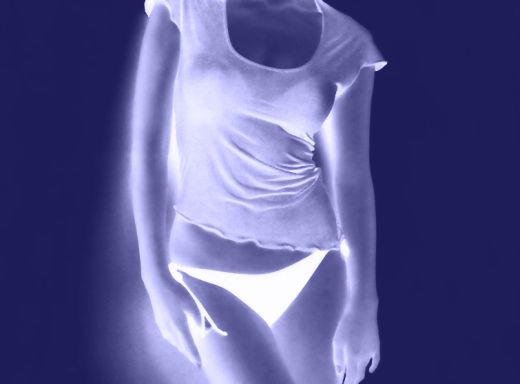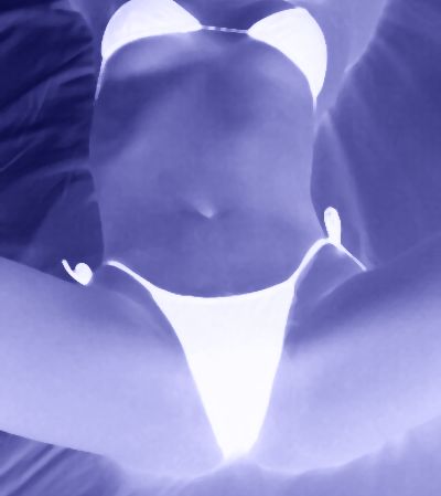 青白くクールに光るビキニ水着画像です。 写真をグレースケールに変換し、ネガ/ポジ反転し、色調を青色に傾けたら、こんな感じになりました。 光と影が逆転した、ちょっと幻想的な雰囲気です。