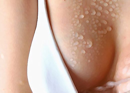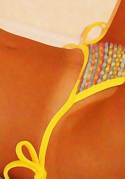 超ズームアップにして比較的シャープなペイント処理をしたビキニ水着画像です。 元写真から特徴的な狭範囲を切り出し、リサイズ(拡大)を行い、拡大のため荒立ってしまった ノイズを十分な中間値フィルタ(MedianFilter)などで低減させます。そして適宜にエッジの強調やレタッチ 系のフィルタ処理を重ねます。そして、色調やコントラストを調整しました。